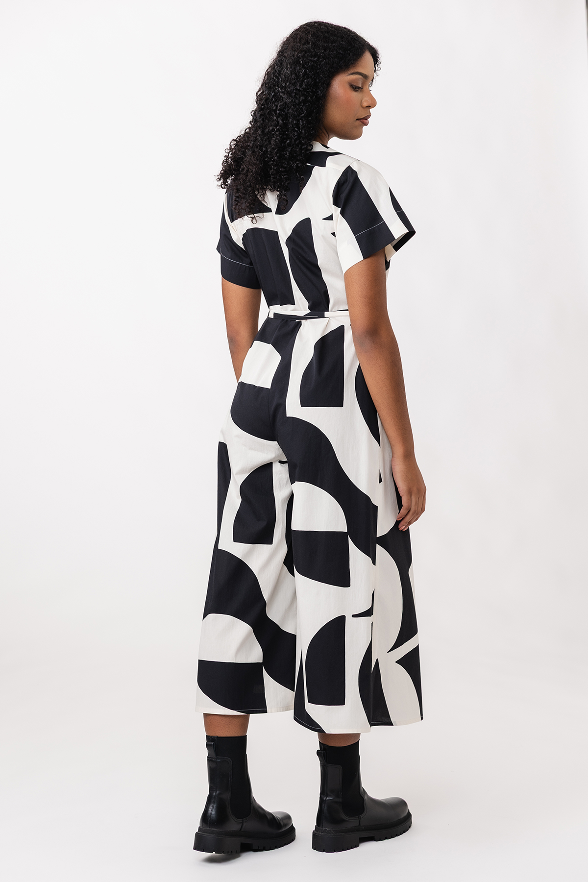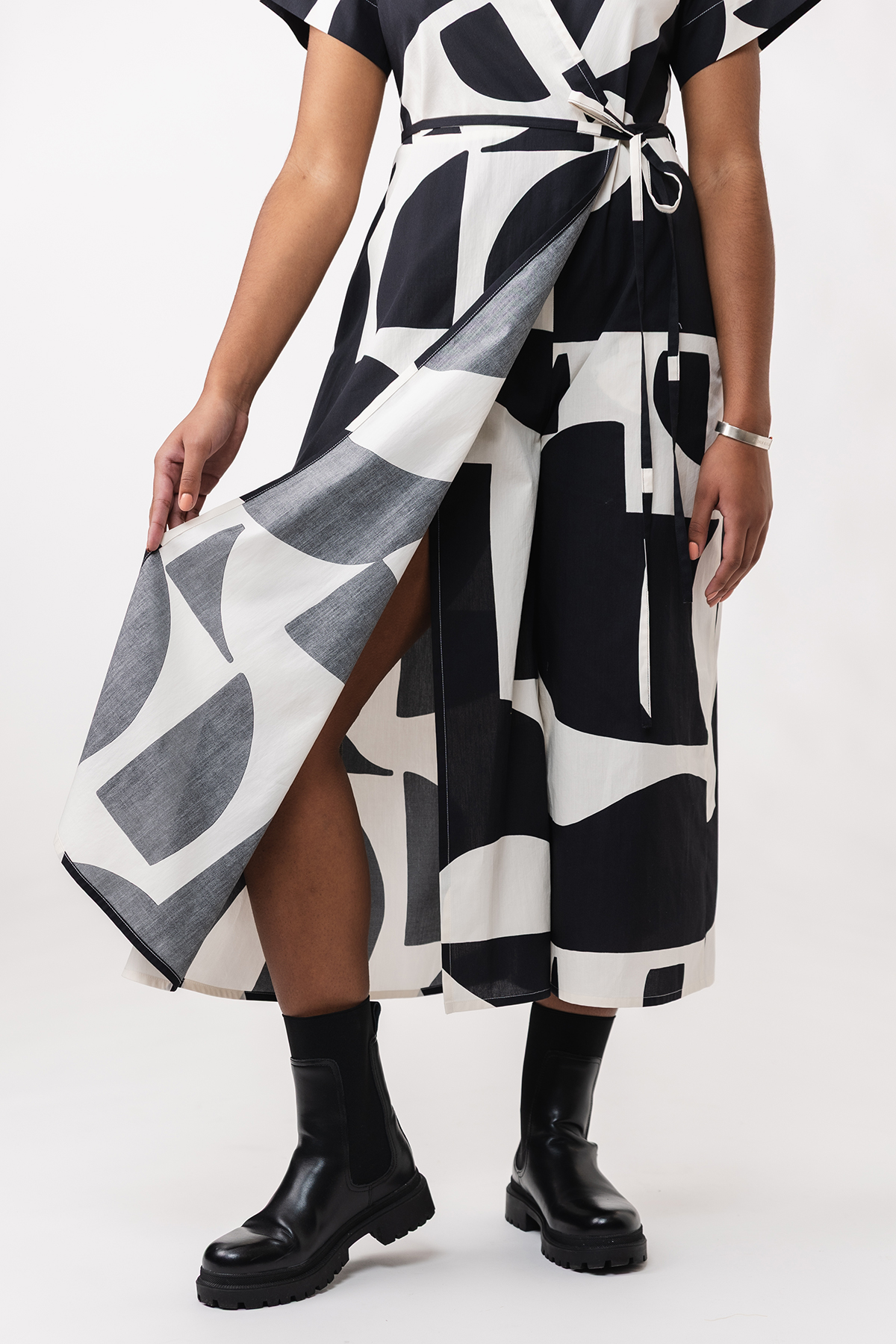 The Hali jumpsuit is a unique wrap garment with an interesting hybrid structure: it features a midi-length trouser bottom that continues as a wrap skirt at the right front. The jumpsuit comes with a semi-fitted wrap bodice, T-shirt sleeves, wrap tie closure and handy side pockets.